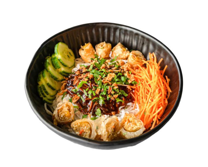 Vermicelles de riz, concombre, carottes, oignons frits, nems, coriandre, sauce maison.
