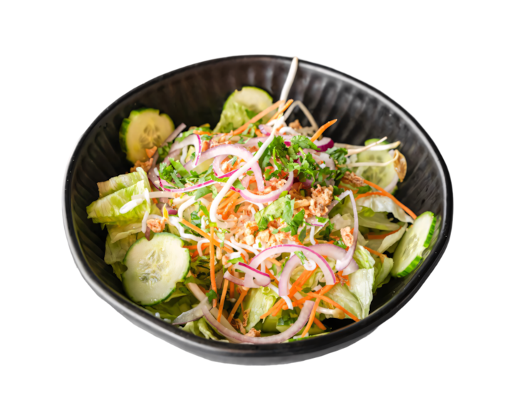 Salade verte, concombre, oignons, vermicelles de riz, cacahuètes, carottes, pousses de soja, coriandre, oignons frits, sauce maison.